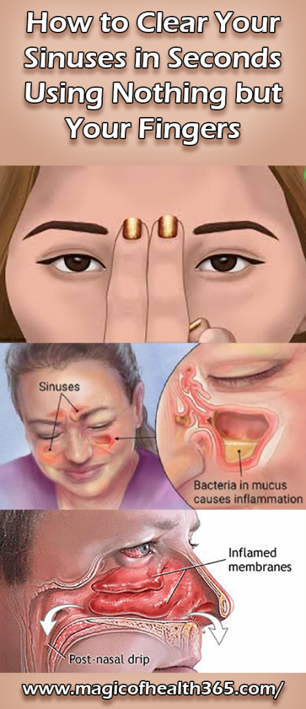 Amber Lynn Vitale, a massage therapist, explains how to clear blockage in the forehead sinuses: apply pressure across the eyebrows to stimulate movement of the mucus. Place your fingers at the beginning of each eyebrow, closer to the central part between the two and then you’re your head forward. Slide the fingers to the middle of both eyebrows, when you fell pressure, hold it, until you feel relief again. Then, continue moving the fingers towards the end of the eyebrows and hold a steady pressure or just move the fingertips in circles- this will stimulate the mucus to flow away from the forehead. At this point, you`ll feel a pressure in the center of your head.