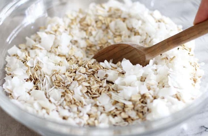 - In a large bowl, mix the oats and coconut flakes well and set aside.